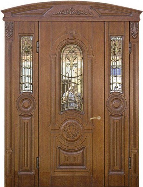 Поскольку в большинстве случаев устанавливаемые на входе в коттедж двустворчатые двери являются еще и предметом интерьера, украшающим здание, их дизайну предается особое значение. Эти двери, как правило, отделываются атмосферостойким МДФ, натуральным шпоном, массивом. Эффектно на таких дверях смотрится витражный узор, применение ковки, зеркальных элементов. Вариантов декора входной двустворчатой двери масса, тут все зависит от пожеланий заказчика.